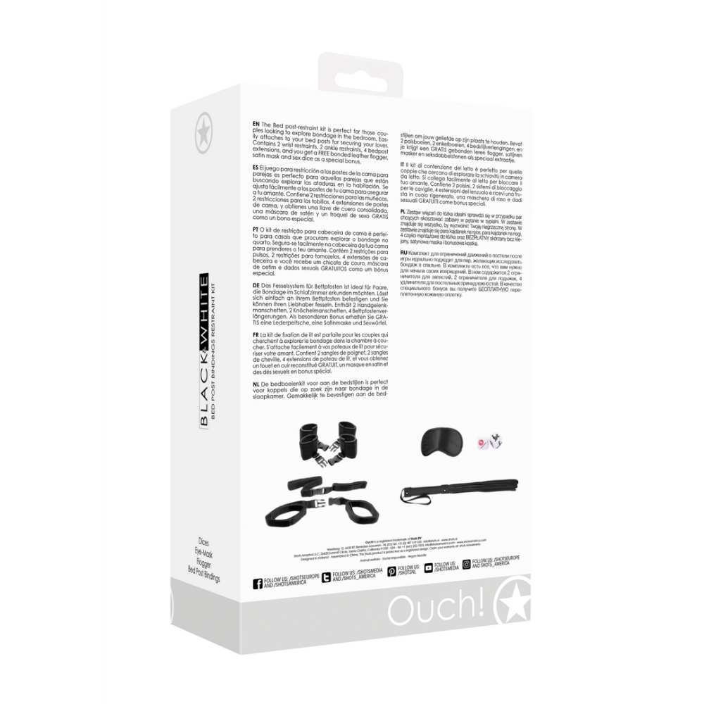 De bedboeienkit voor aan de bedstijlen is per- fect voor koppels die op zoek zijn naar bondage in de slaapkamer. Gemakkelijk te bevestigen aan de bedstijlen om jouw geliefde op zijn plaats te houden. De kit heeft alles wat je nodig hebt om je kinky kant te ontdekken. Bevat 2 polsboeien, 2 enkelboeien, 4 bedstijlverlengingen, en je krijgt een GRATIS leren flog- ger, satijnen masker en seksdobbelstenen als speciaal extraatje.