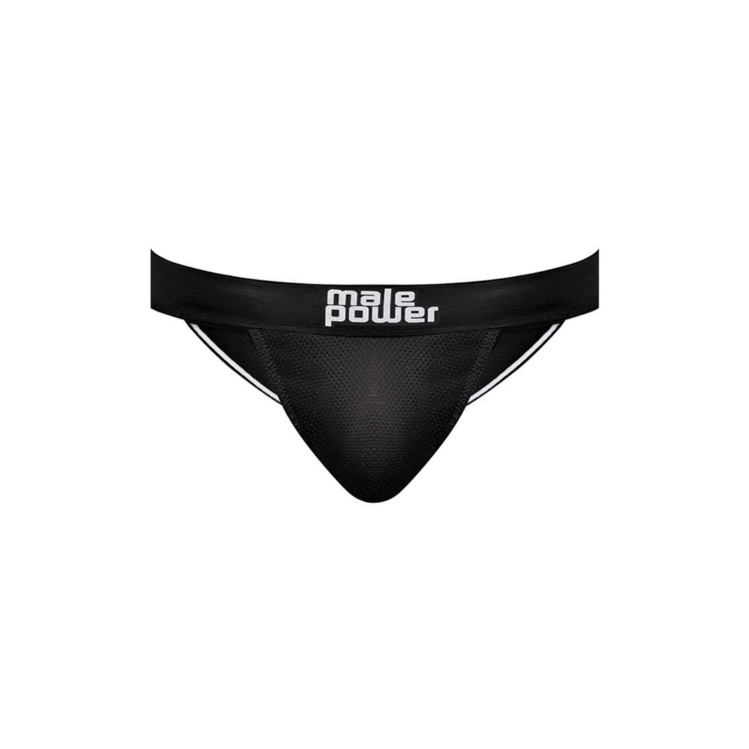 From the Black Nite collection by Male Power, this style includes: A jock featuring sporty striped elastic inserts, plush elastic leg bands, and an ultra-sleek branded waistband.