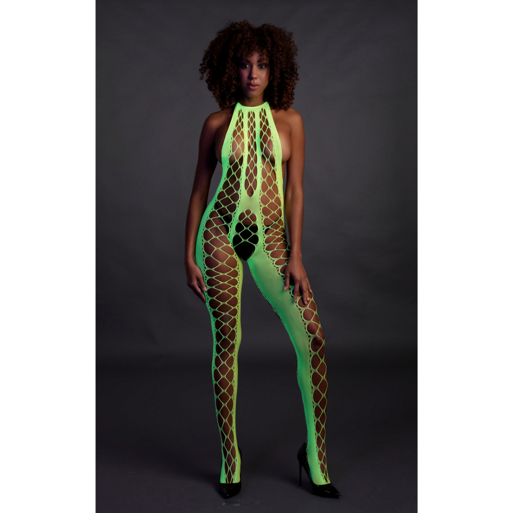 Our Neon lingerie is the perfect addition to your collection. Made with comfortable, easytofit, stretchy materials they are designed to fit your body perfectly. Whether you're using them as party wear or as lingerie, this eye-catching piece will make sure you stand out! Unleash your inner goddess with this stunning UV activated lingerie. This gorgeous bodystocking has a showstopping halterneck and a low-cut back. An amazing party-wear that gives you that wow-factor and makes you stand out. The UV activated materials adds a touch of mystery and allure. Easy to fit because of the stretchy materials will make you light up the night. Available in neon pink and neon green. Sizes run from XS/ XL to XL/XXXXL