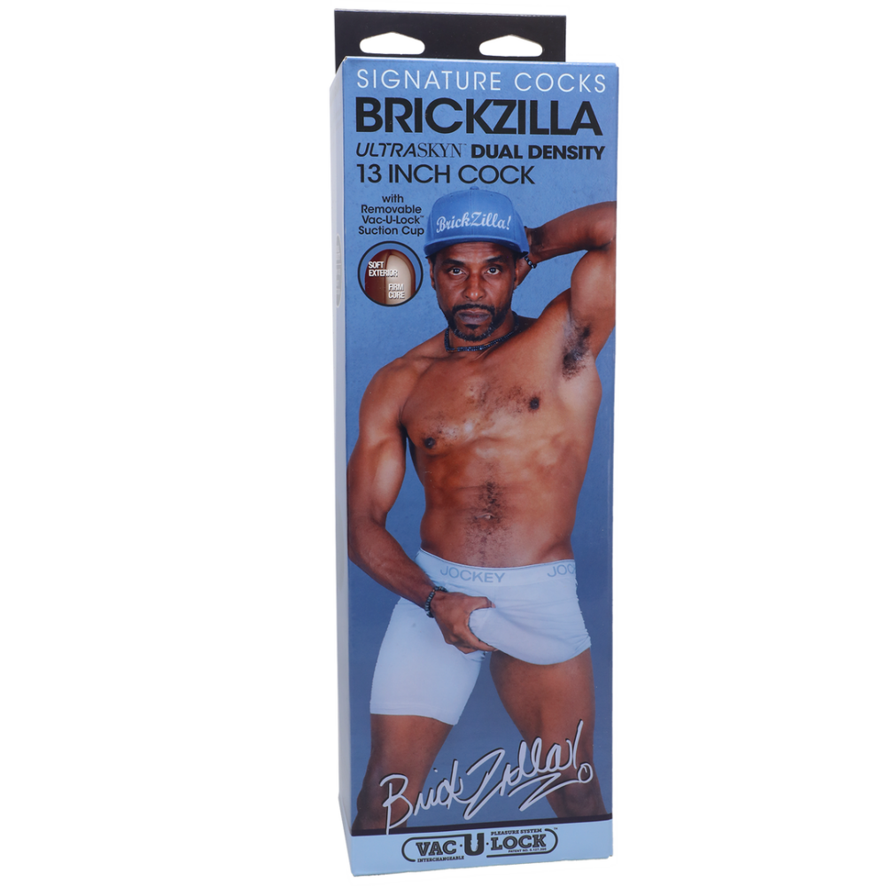 Brickzilla's massive Signature Cock is molded directly from his body and handcrafted in dual density ULTRASKYN, with lifelike veins and curves for the ultimate porn star experience. This material perfectly captures every detail, mimics the unique feel of real skin, and warms to body temperature with use.