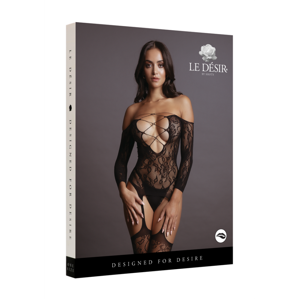 Bodystocking van kantpatroon met jarretelles en diepe V-hals met gekruiste bandjes. Kan op of van de schouders worden gedragen. De zachte, superelastische stof is geschikt voor maten S tot XL.